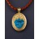 This is an exquisite double-sided, 18kt gold, tufa cast pendant by Darryl Dean Begay. On one side, Darryl has created a beautiful mountain scene of gem grade natural Lone Mountain turquoise. On the other side, Darryl has set natural Godber turquoise with a heavily webbed matrix and coral beads to form a handsome weaving motif. Two very distinct looks hanging from one braided leather strap. The pendant is 2" long x 1 1/8" side. The length of the necklace is 16 1/2" long. The pendant is, of course, signed, "Darryl D Begay" on the top where it hangs from the leather.