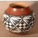 A black and white pattern of leaves and geometric configurations has been painted in Laguna Pueblo style on a very well-formed redware pottery jar. Signed Y. Lucas for Yvonne Lucas with an etched mudhead symbol. 7" diameter x 6 3/8" height.